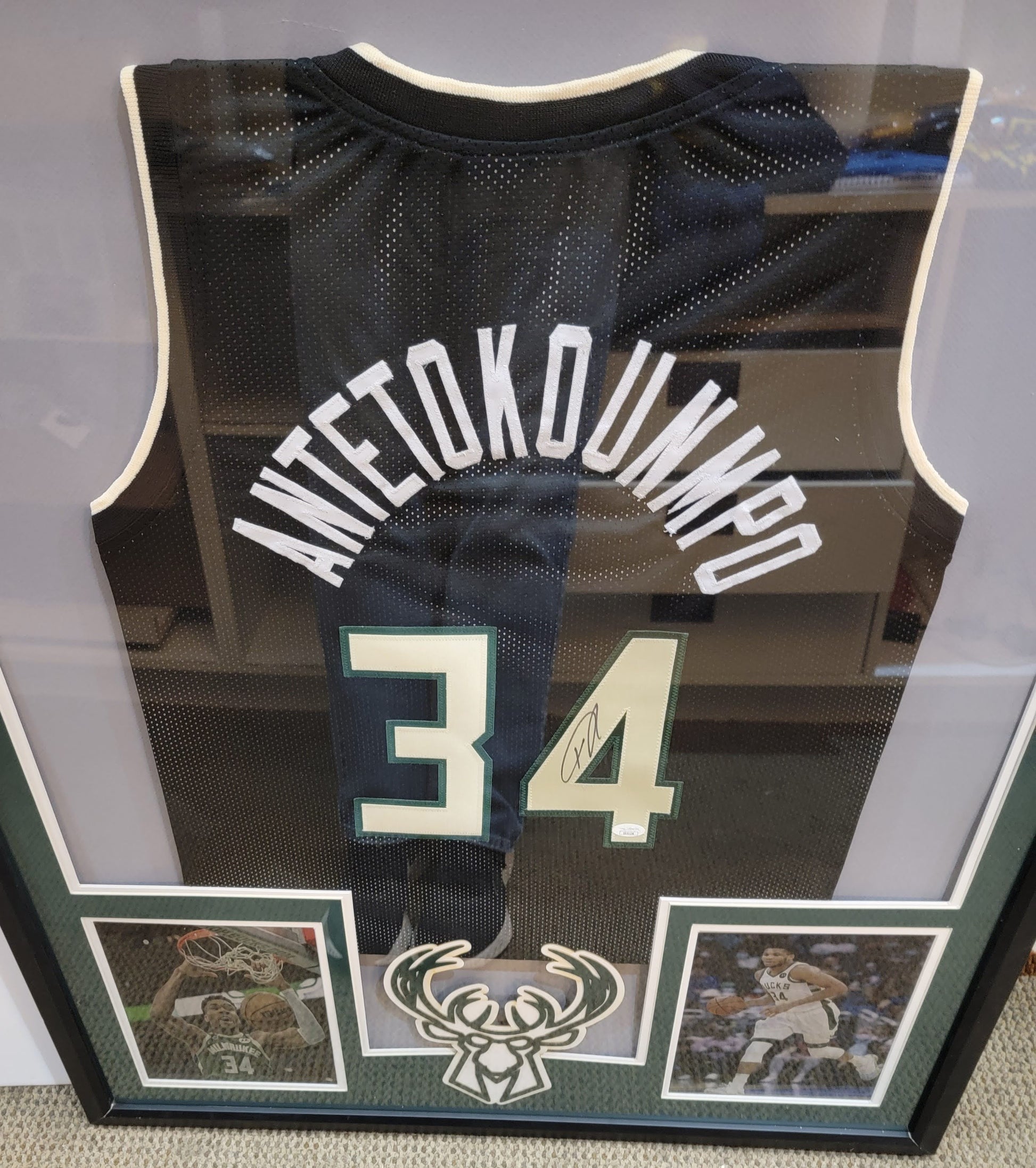 This product is for us framing your jersey. You send your jersey to us or take it to one of our stores and we frame your jersey in this Large frame. Size 34x42. Comes with Double matting that you chose the mat colors. You have the option of choosing two metallic photo that your upload or we select your photos for you. Real Wood frames.